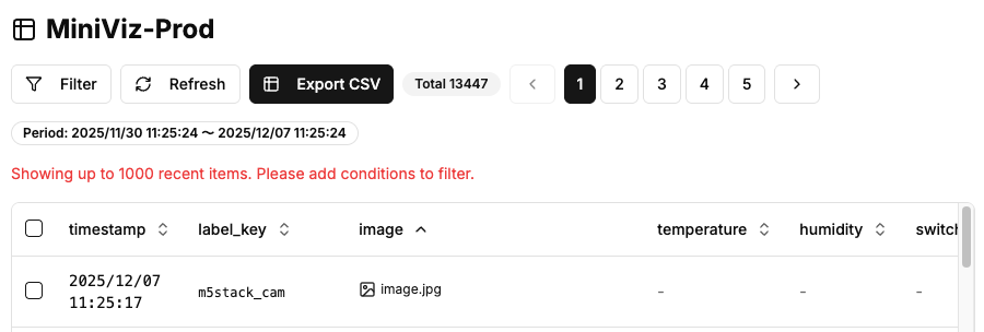 minivizのデータベースメニューからデータを確認します。